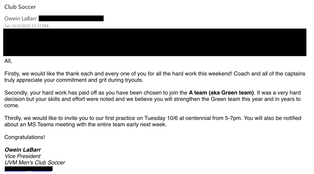 Email from the former UVM Men’s Club Soccer Vice President Owein LaBarr to all tryout participants about logistics. This time, I was successful. I remember being ecstatic at the news. Not only was I making one step closer to my dream, but I was now apart of something. This prior lack of being apart of something, of community, was likely the main contributor to my freshman year struggles.