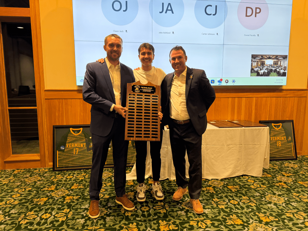 With my coaches Brad Cole (left) and Rob Dow (right) after being named recipient of the Hal Greig Award. That stamped an end to my Vermont Soccer journey – I felt so much gratitude towards my coaches who believed in me when I asked them for a chance, my teammates who supported me when I had my head down during training, and my family who trusted me to keep pushing even when it seemed, for a long time, like a dream that would never become a reality.