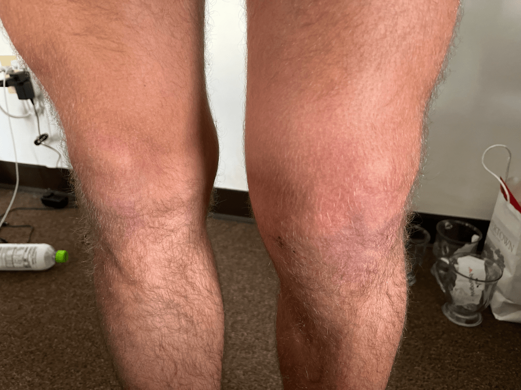 Swelling of left knee one day after patella dislocation. This injury fully took me away from the game and took about five months before I was able to play again in any competitive capacity.