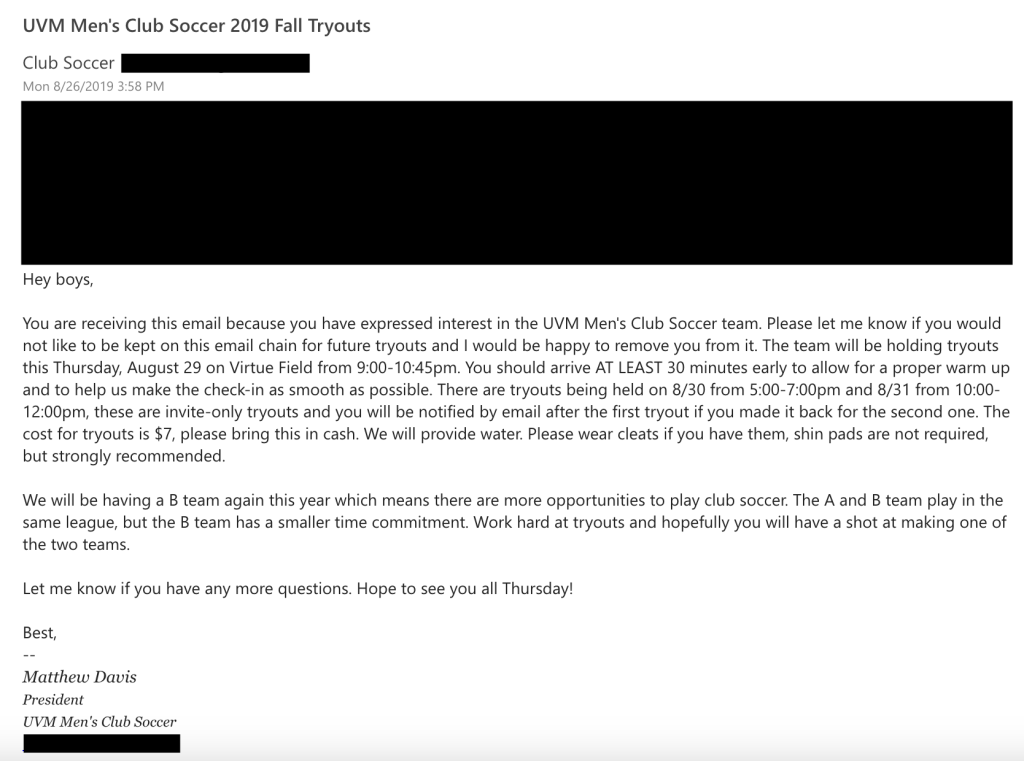 Email from the former UVM MCS President Matthew Davis to all tryout participants who were selected for the second round of tryouts. At the conclusion of day two, I returned to my dorm room and waited for an email notifying me of which team I would be making. Unfortunately no email came, meaning I was one of only a few players from the second tryout who were not selected for the A or B-team. I remember a feeling and a sensation of my identity slipping away. I had always been “the soccer kid” growing up and had high expectations of playing college soccer at the varsity level, but here I was cut from the club team. I cried at my desk feeling worthless and ashamed. Desperate to reclaim my slipping identity, I reached out to a friend who had been selected, hoping for a second chance.