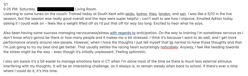 Journal entry describing feelings after making the leap along with comments about performance anxiety and early changes from interventions. The coaches agreed to allow me to train with the team once a week in the Spring.