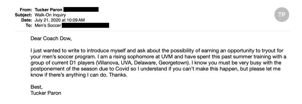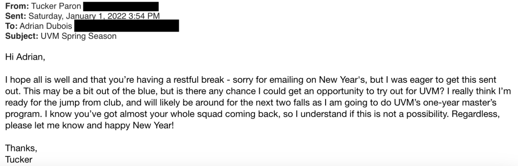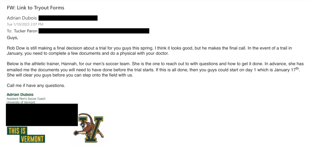 Email from former Associate Head Coach Adrian Dubois requesting paperwork so myself and a Club teammate could begin our trial with the Varsity team. January 2023 Cut from Vermont Green FC for a third time