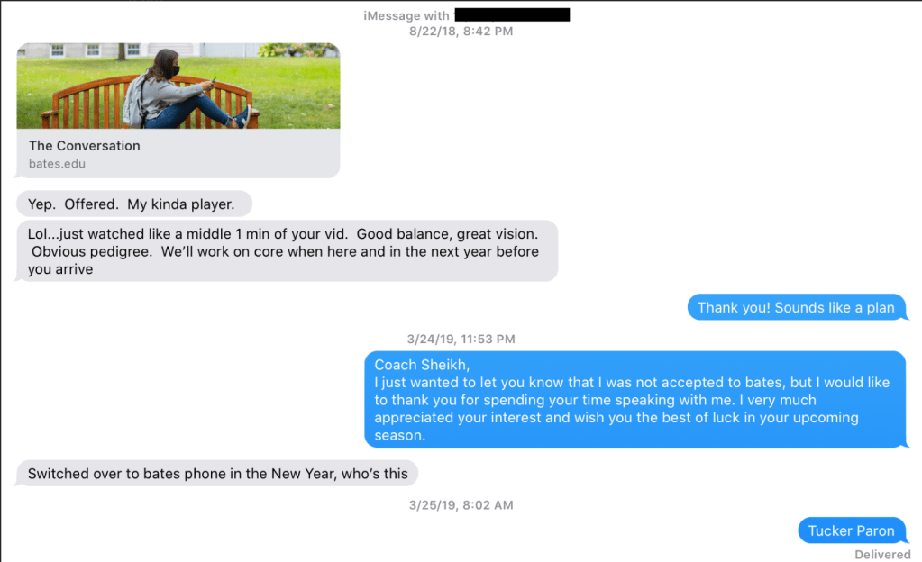 Texts with former Bates Head Coach Tyler Sheikh detailing an unoffical offer followed by a rejection by the school and no response after re-identifying myself. May 2019 Enrolled in University of Vermont as non-athlete