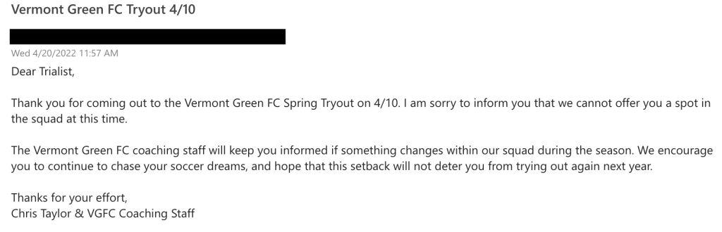 After being cut from UVM Varsity, I tried out again for Vermont Green just ahead of their first summer campaign. I received another rejection email.