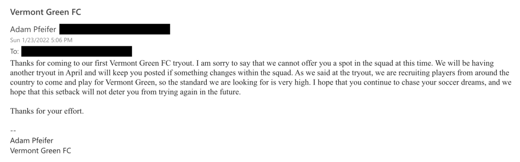 VGFC Head Coach Adam Pfeifer notifying me that I was not selected for the 2022 Summer roster after the Winter Tryout. February 2022 Cut from UVM Varsity